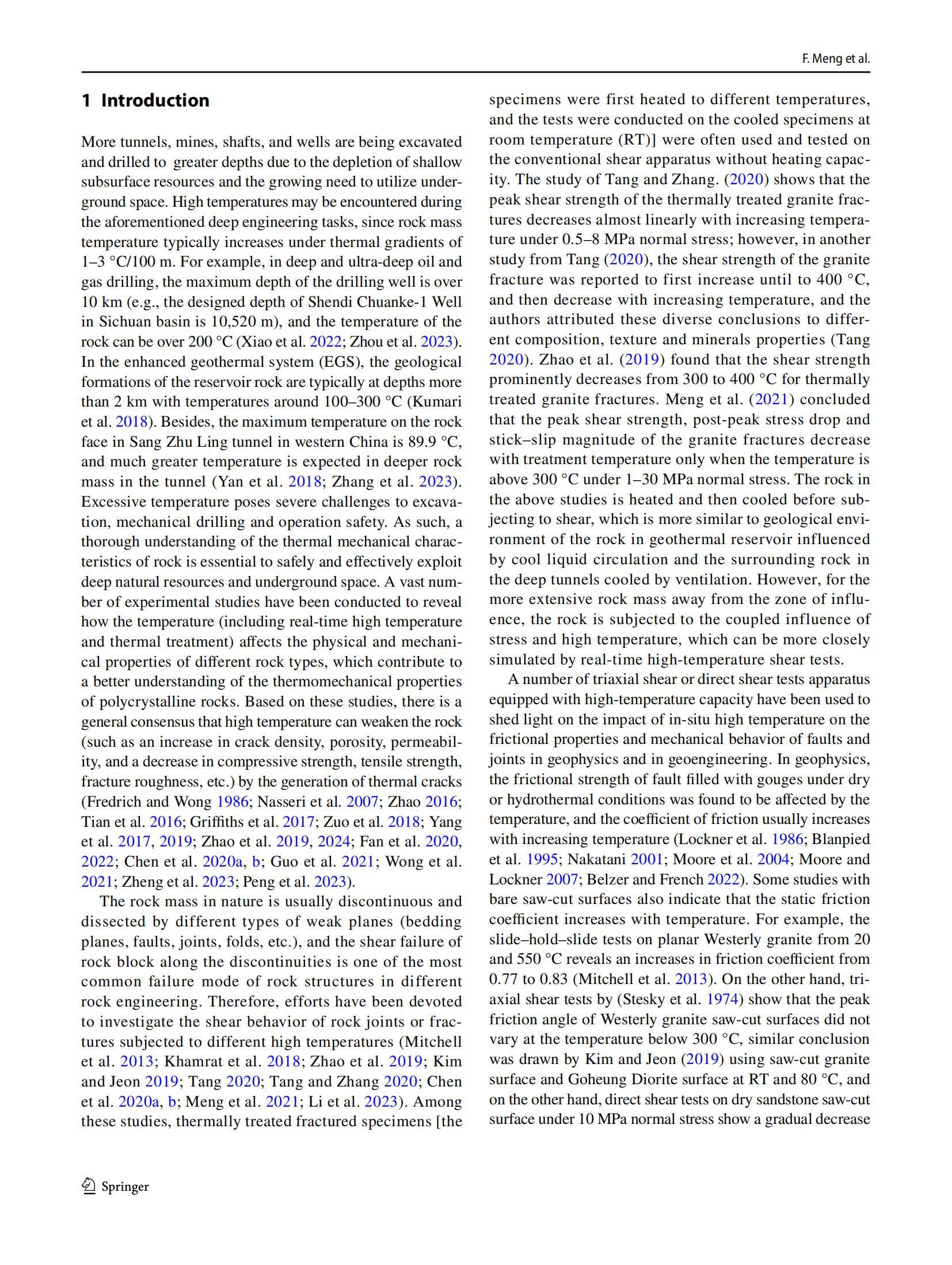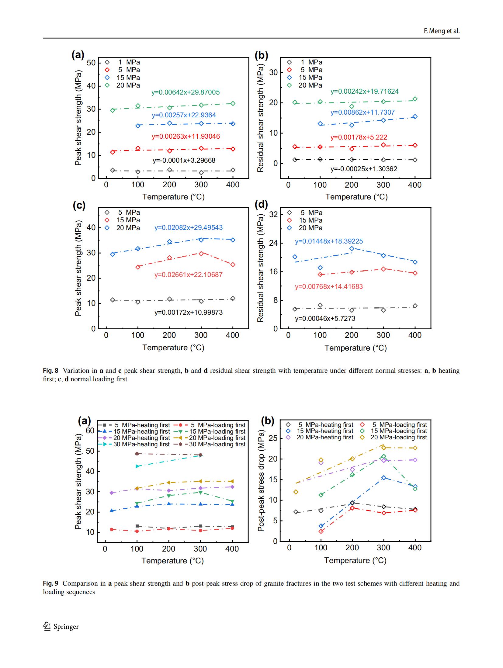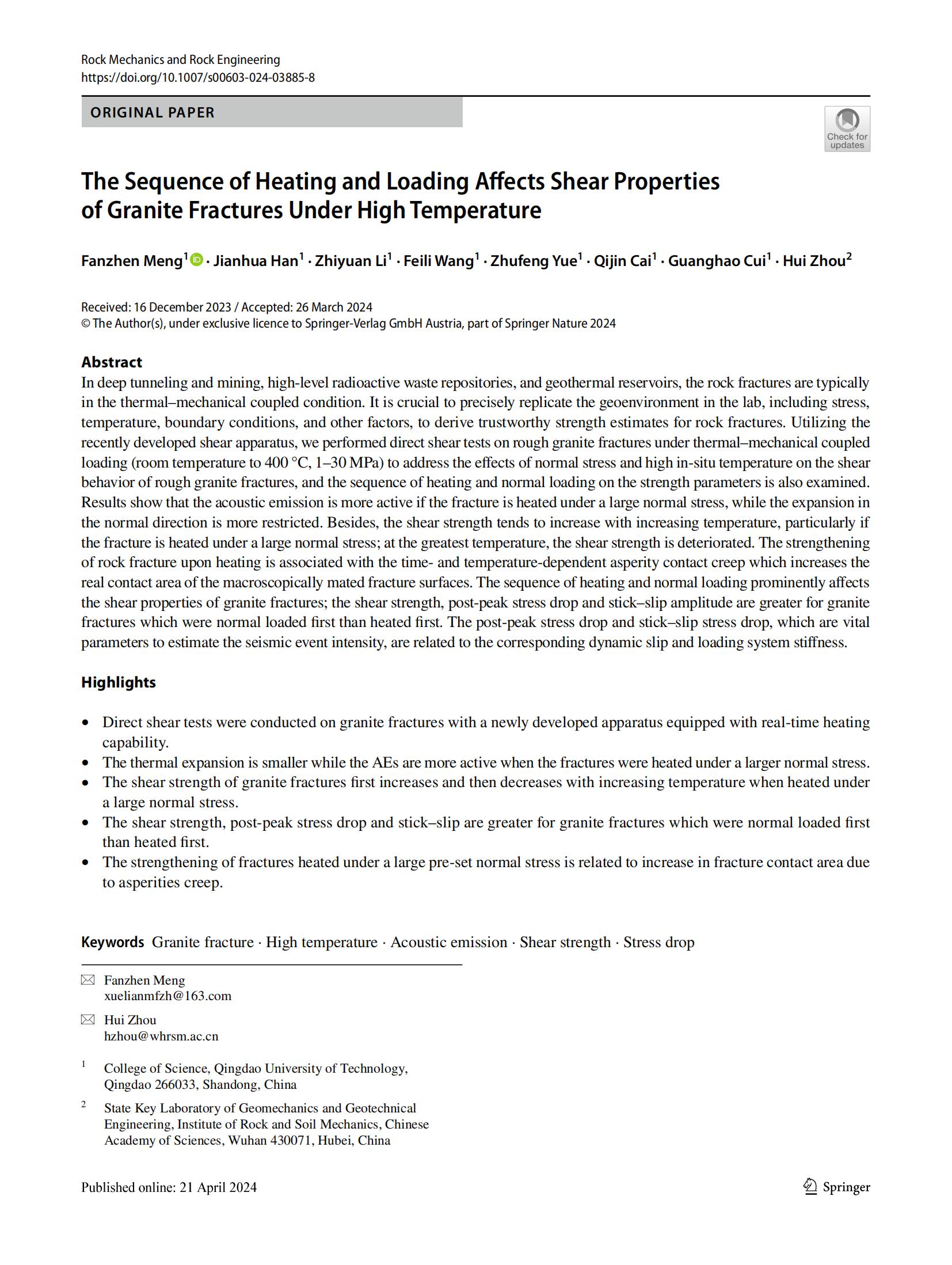 我公司联合青岛理工大学成功研制《岩石高温高压下剪切试验系统》,此次合作成果发表于《岩石力学与岩土工程》,该试验仪的试验结果显示,在高法向应力约束下加热的裂隙,其声发射活动更为活跃,但法向膨胀变形受到更强抑制;随着温度升高,裂隙剪切强度总体呈增长趋势,这种强化效应在高法向应力加热条件下尤为显著,但在极限温度(400℃)下出现强度劣化。加热导致的裂隙强度增强与粗糙体接触蠕变(具有时间-温度依赖性)密切相关,该过程增大了宏观吻合裂隙面的真实接触面积。加热与法向加载顺序会显著影响花岗岩裂隙的剪切特性:相较于先加热后加载的裂隙,先加载法向应力再加热的裂隙表现出更高的剪切强度、更显著的峰后应力降及更强烈的粘滑振幅。作为评估地震事件强度的关键指标,峰后应力降与粘滑应力降的幅值同动态滑移量及加载系统刚度密切相关。
